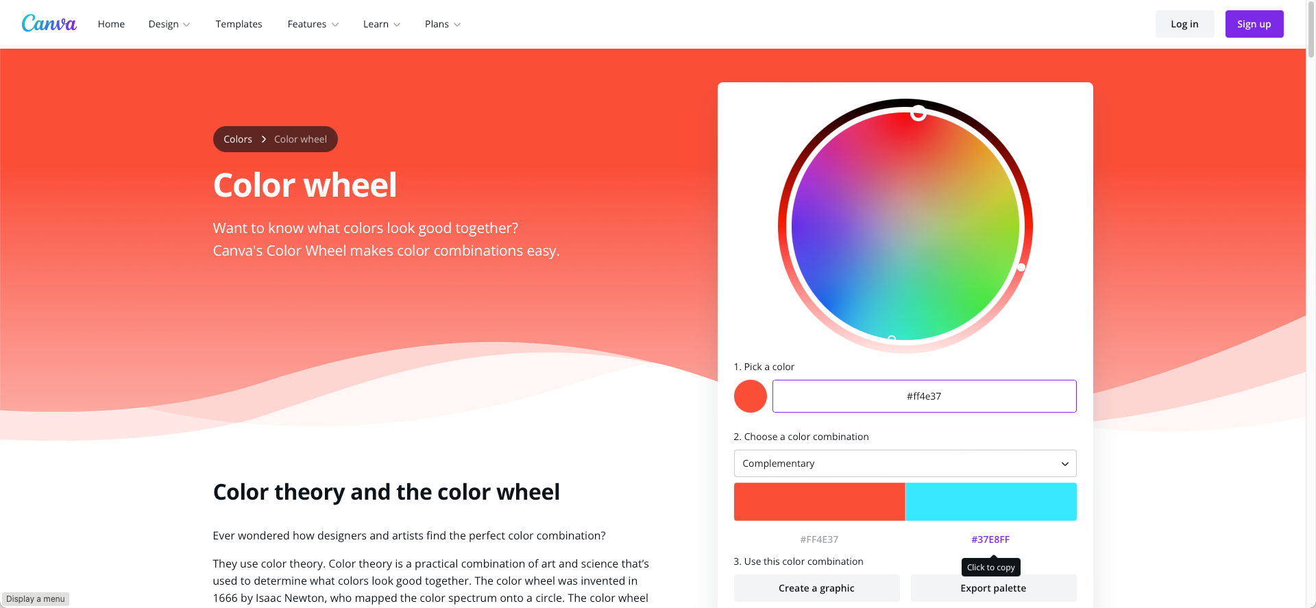 We want to colour the basemap to complement the red on the female icon earlier. So, let's head to Canva Color Wheel website to find that colour. Then, enter the HEX from the icon ('#ff4e37'), choose Complementary colour combination, and you'll obtain blue #37E8FF. Click to copy it.