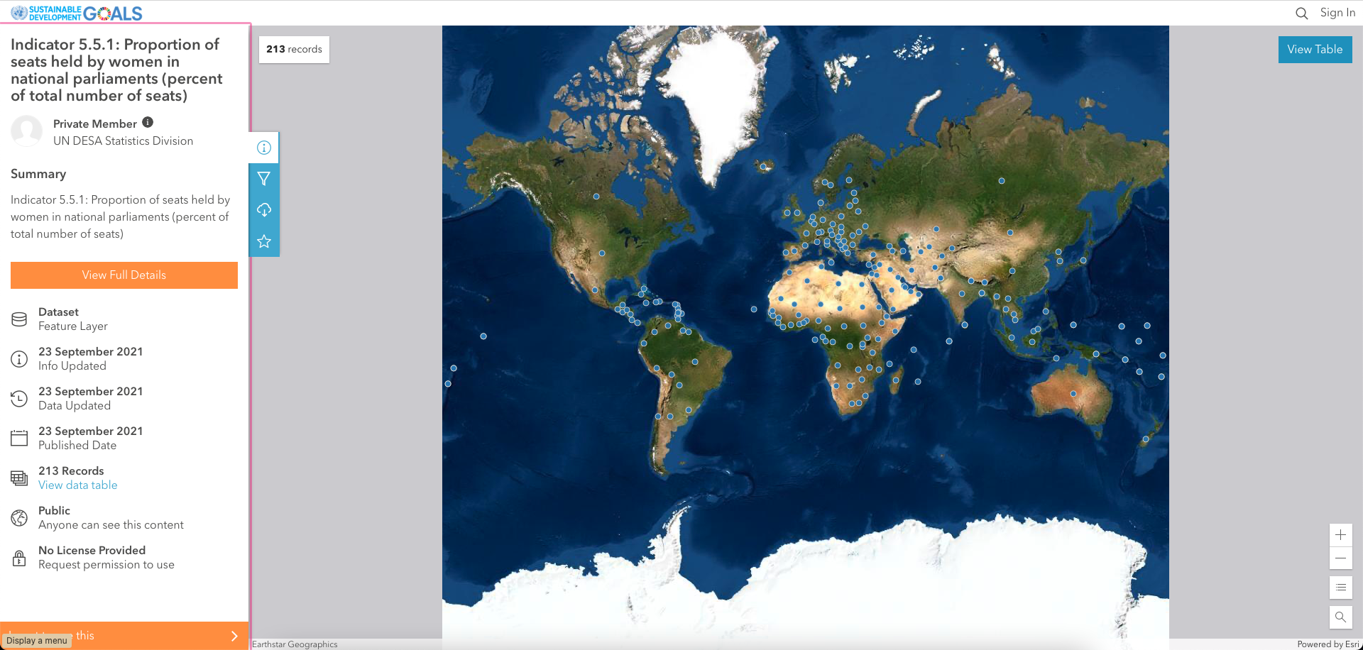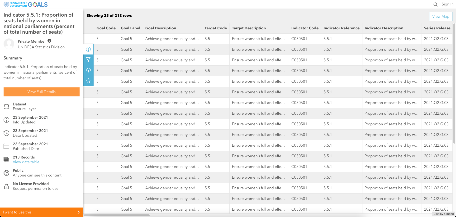 The data we will use in this tutorial is available in the UN Stats Open SDG Data Hub, a collection of geospatially referenced data by sustainable development goals. We're specifically interested in the following dataset: