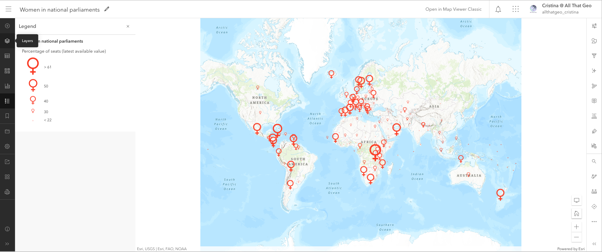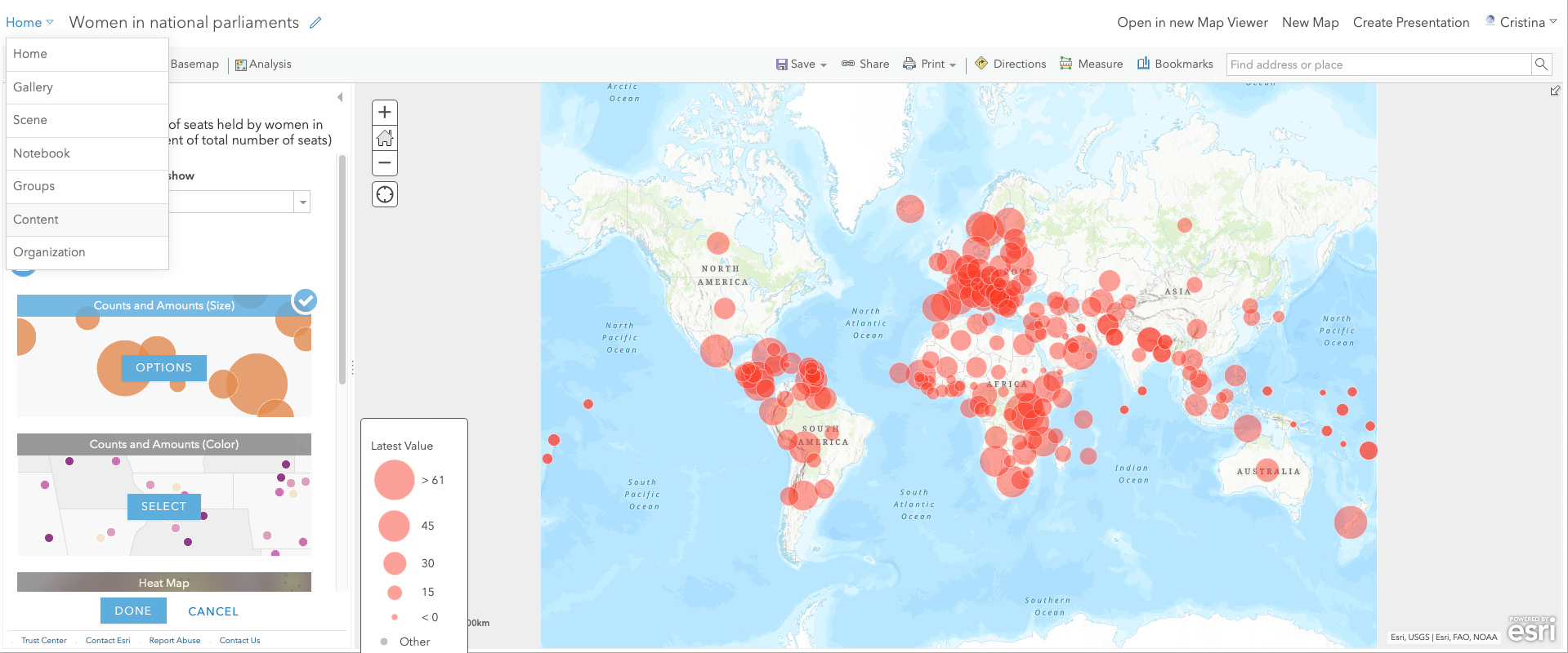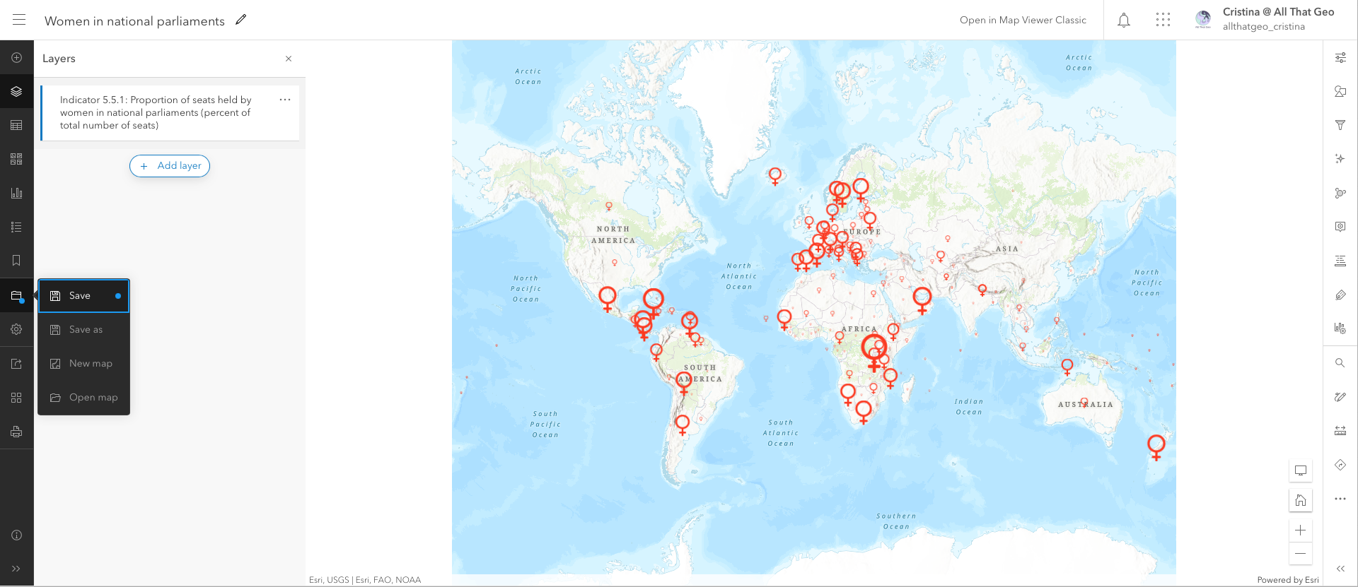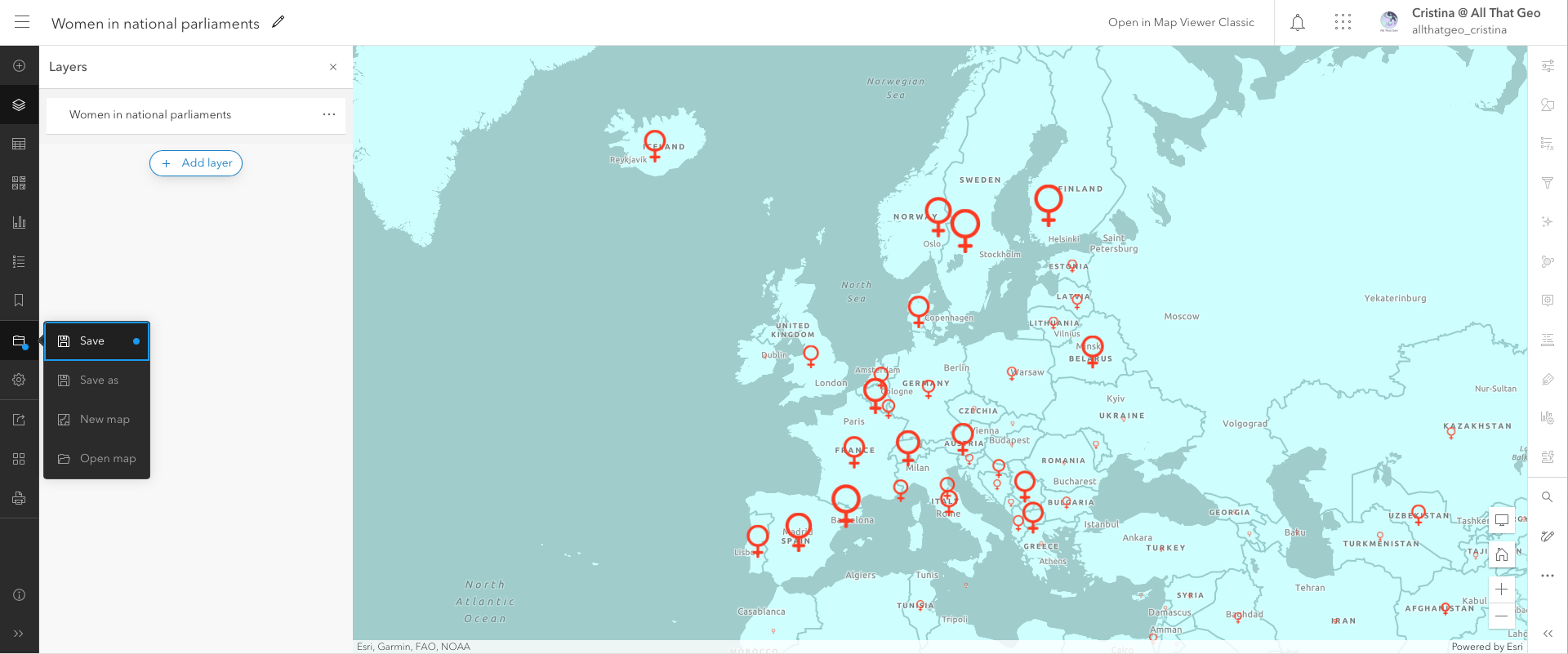 Go back to My Content. Click on the three dots next to the web map you saved earlier, Women in national parliaments, and choose Open in Map Viewer Classic.