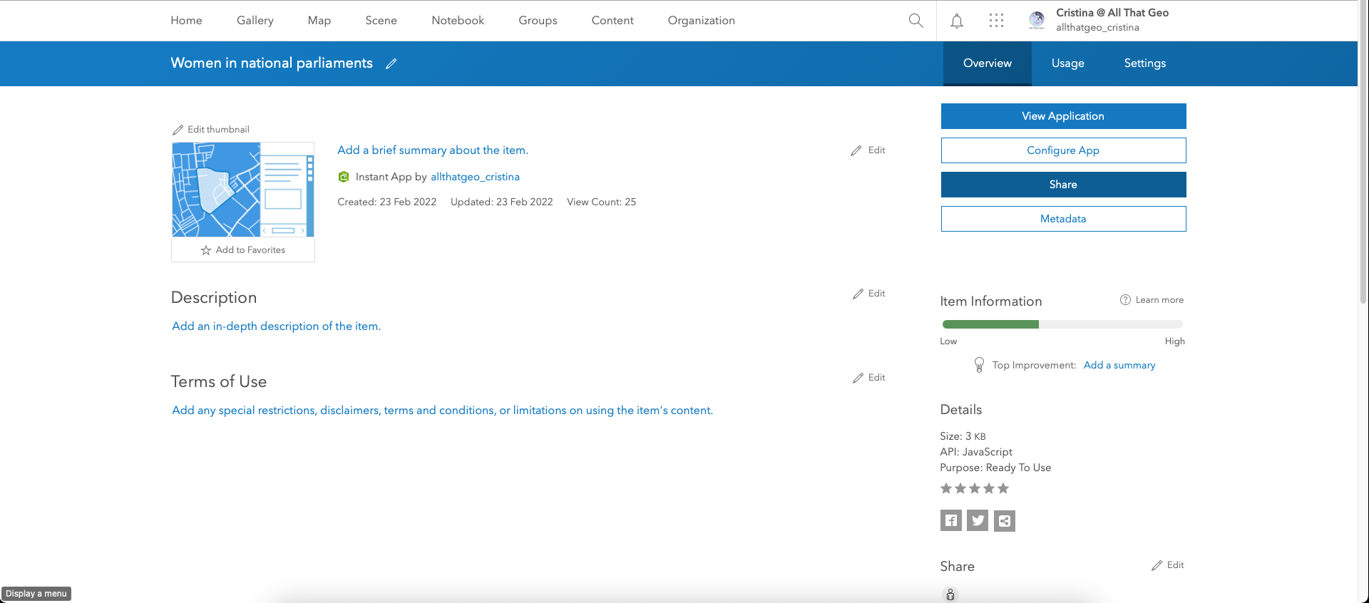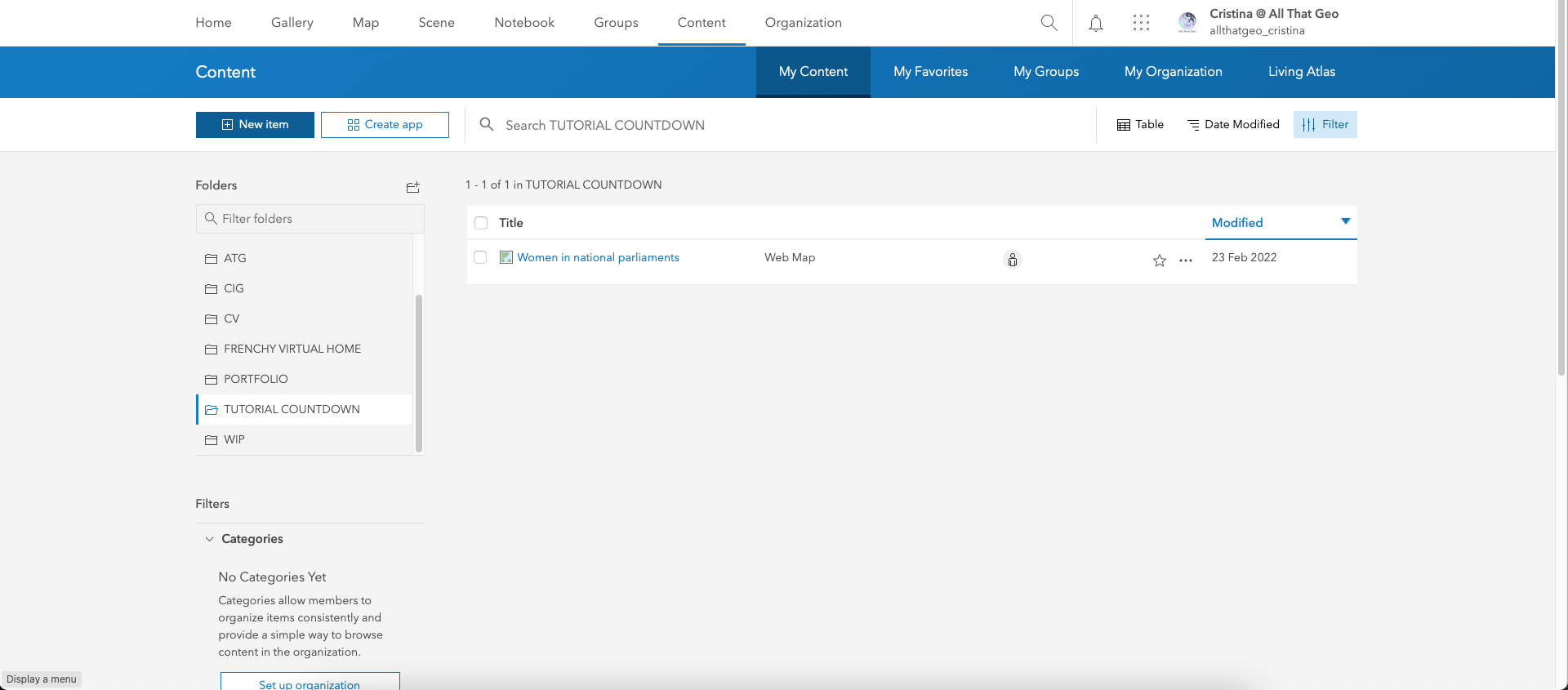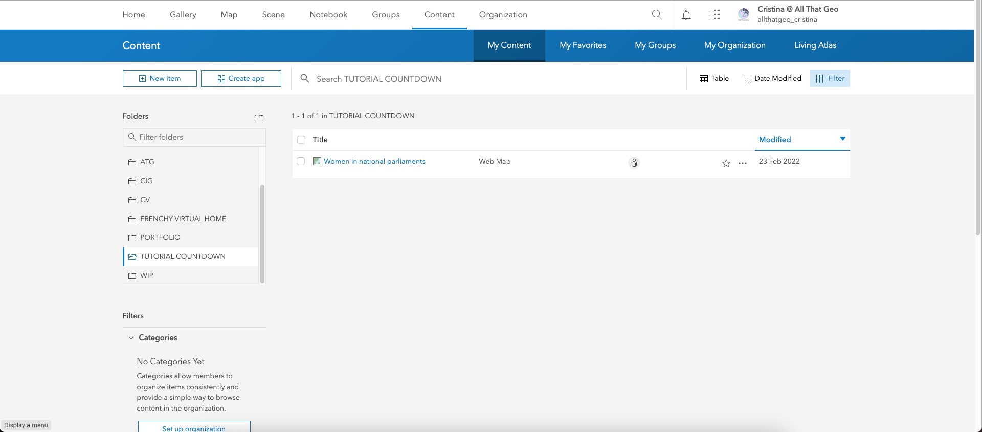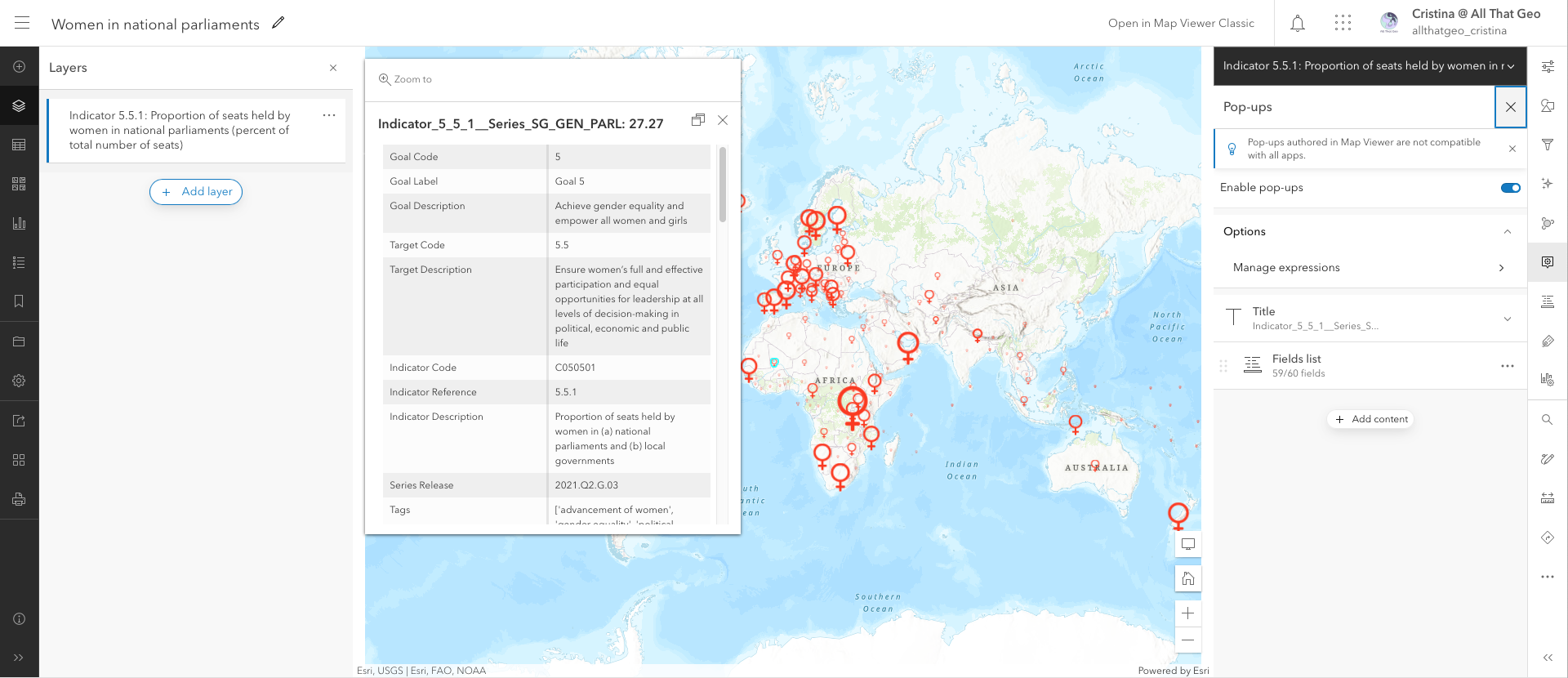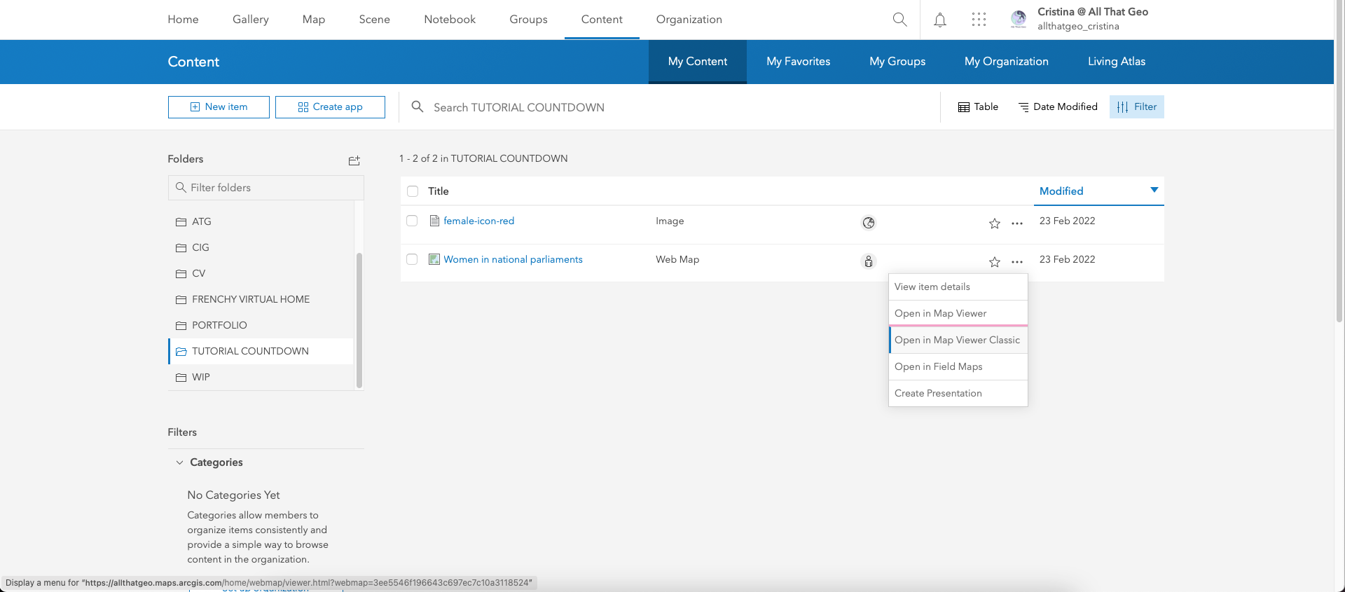 Go back to My Content. Click on the three dots next to the web map you saved earlier, Women in national parliaments, and choose Open in Map Viewer Classic.