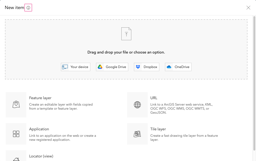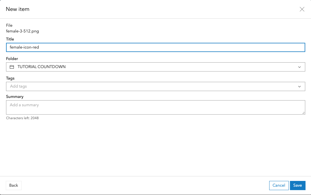 Now that we have the icon to use in the web map, we'll add it to our ArcGIS Online content. In My Content, click on New item on the top left.