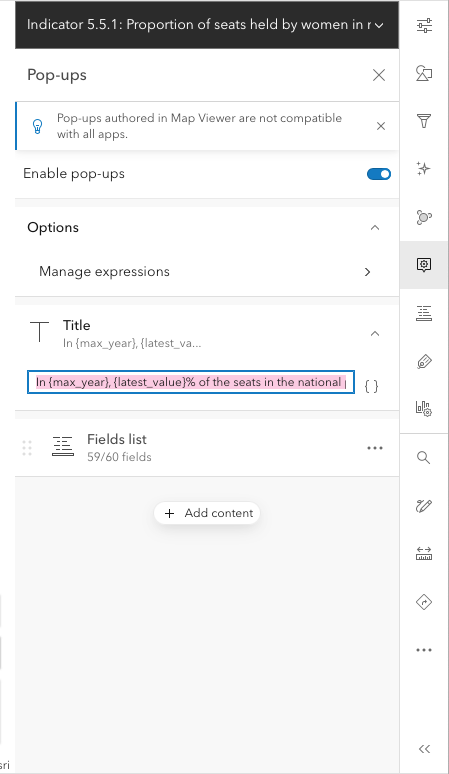 Expand Title and enter 'In {max_year}, {latest_value}% of the seats in the national parliament of {geoAreaName} were held by women'.
