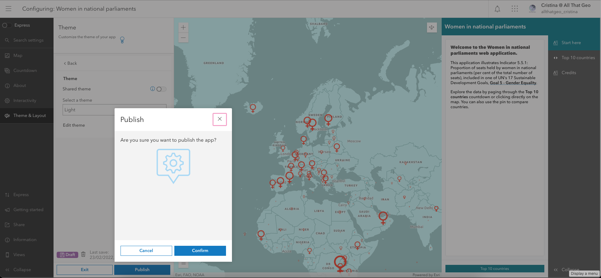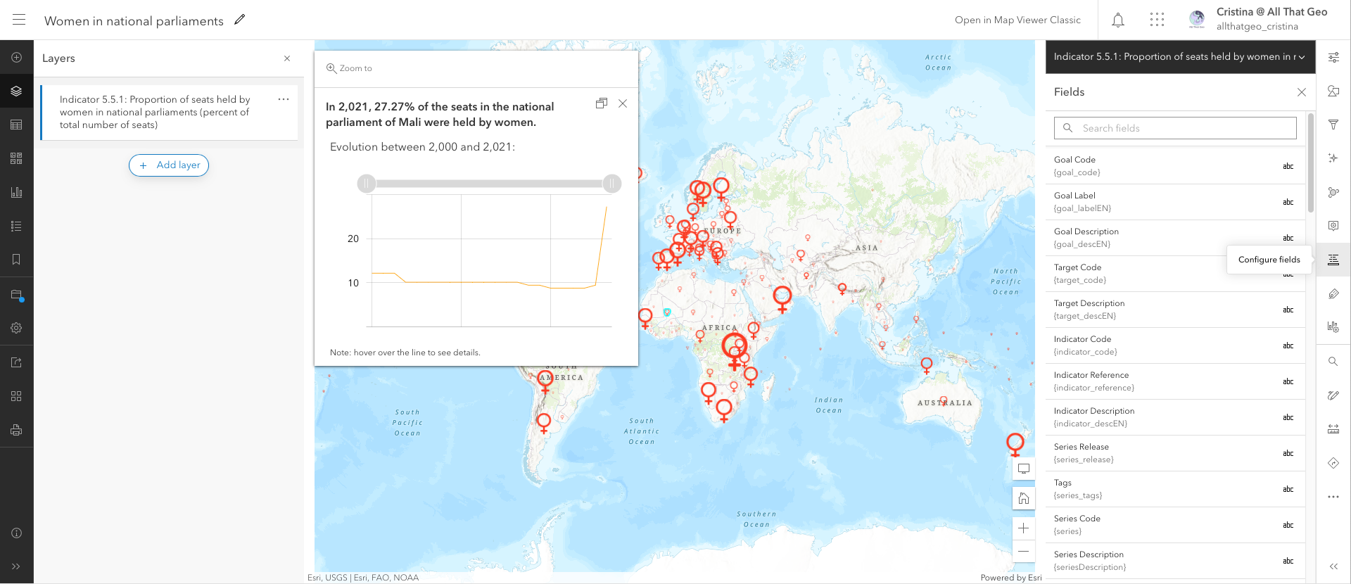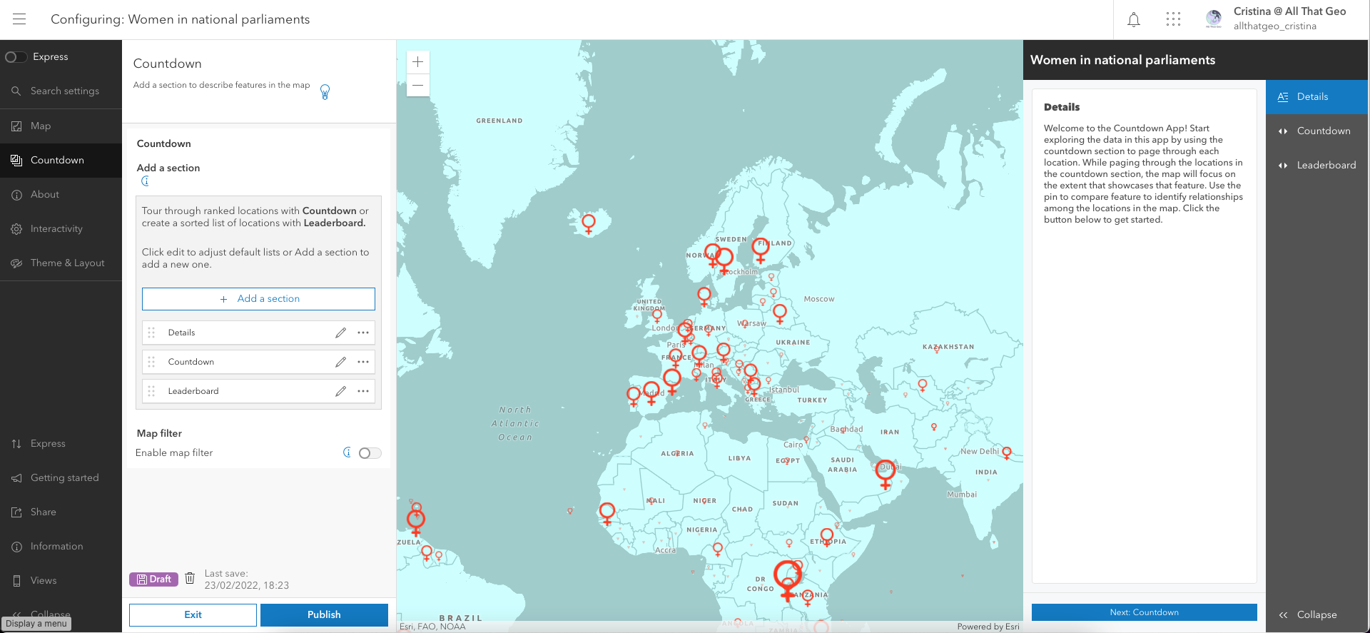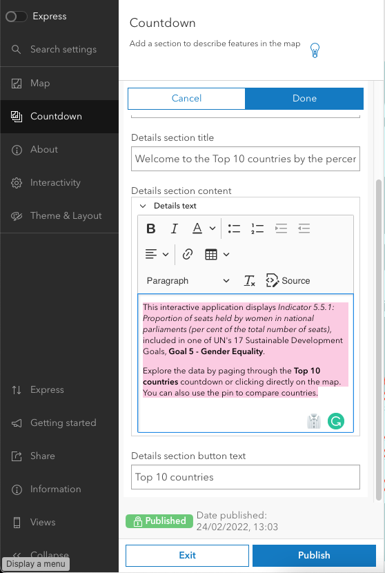 You can follow along and adapt this tutorial to your projects; this particular Instant App – Countdown template - is ideal for keeping track of an indicator, comparing locations and showing temporal trends.