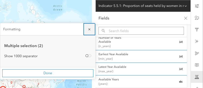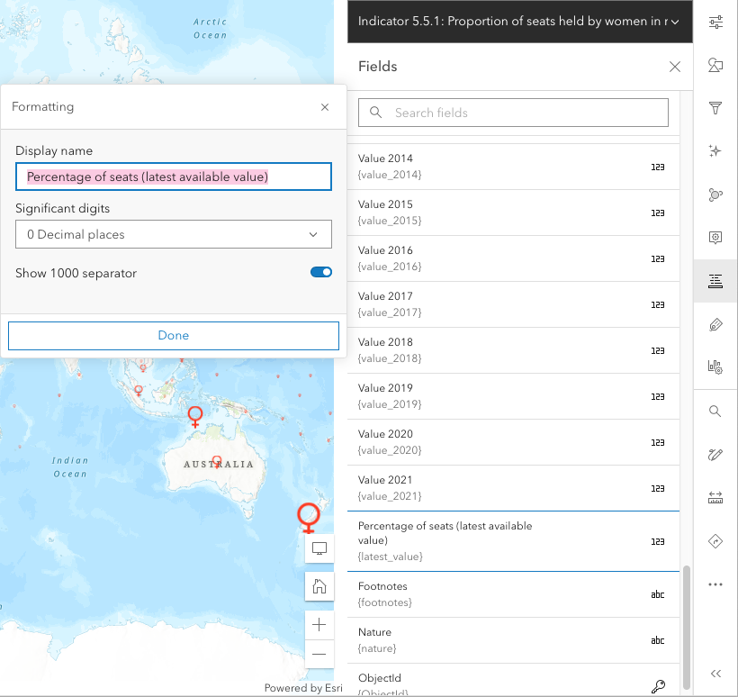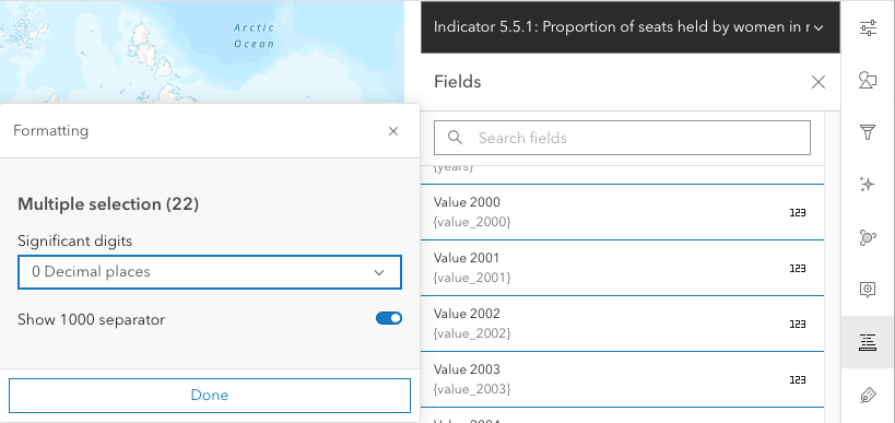 - Change Latest Value to Percentage of seats (latest available value) and 0 Decimal places. This will show on the legend. Click Done.