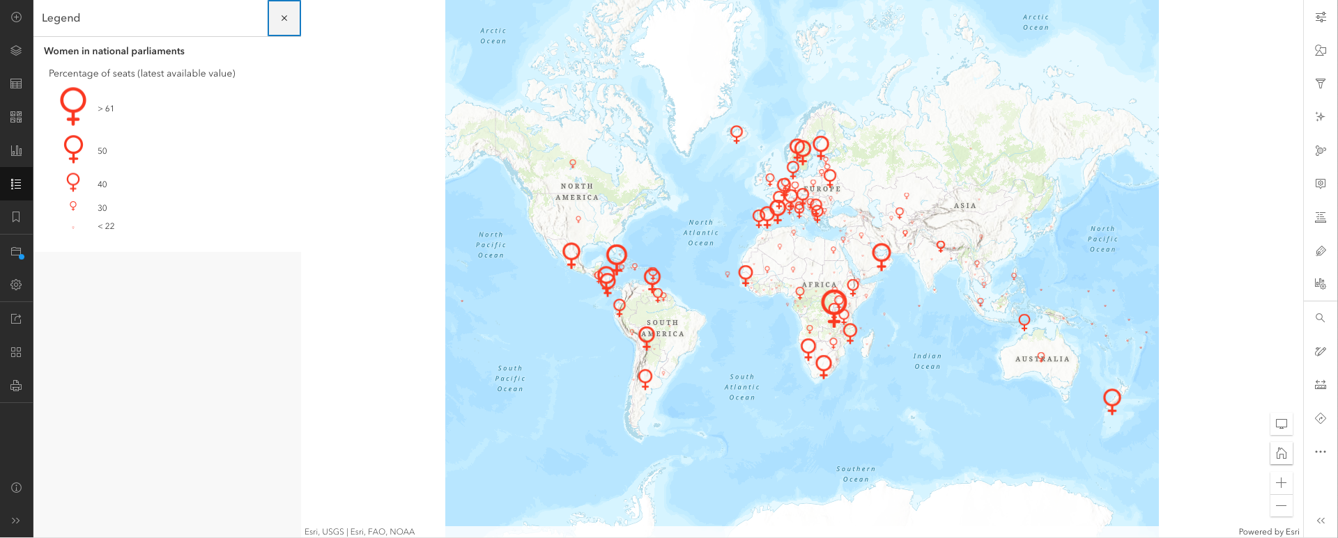 P.S. I will finish this tutorial by leaving you with an alternative map. If you recall, we highlighted the countries where the percentage was higher than the average when creating the web map. Let's call it the glass half full approach. If we had followed a truly gender equality approach, we would have highlighted the countries where women represent at least half of the seats in national parliaments. Well, this would have been the map: