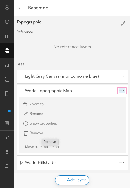 Click on the three dots next to World Topographic Map and select Remove. Next, do the same for World Hillshade.