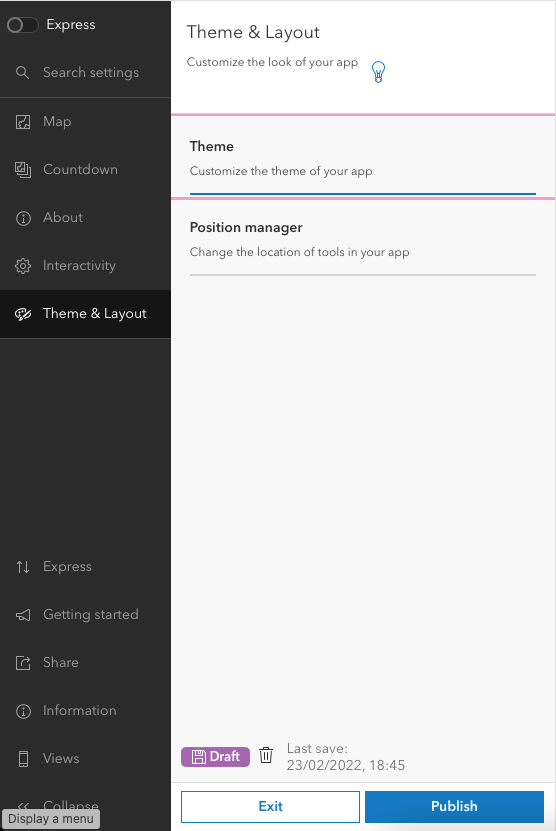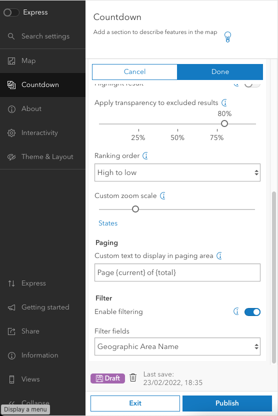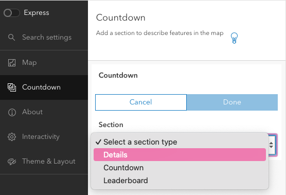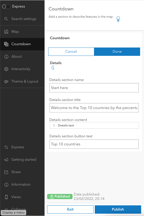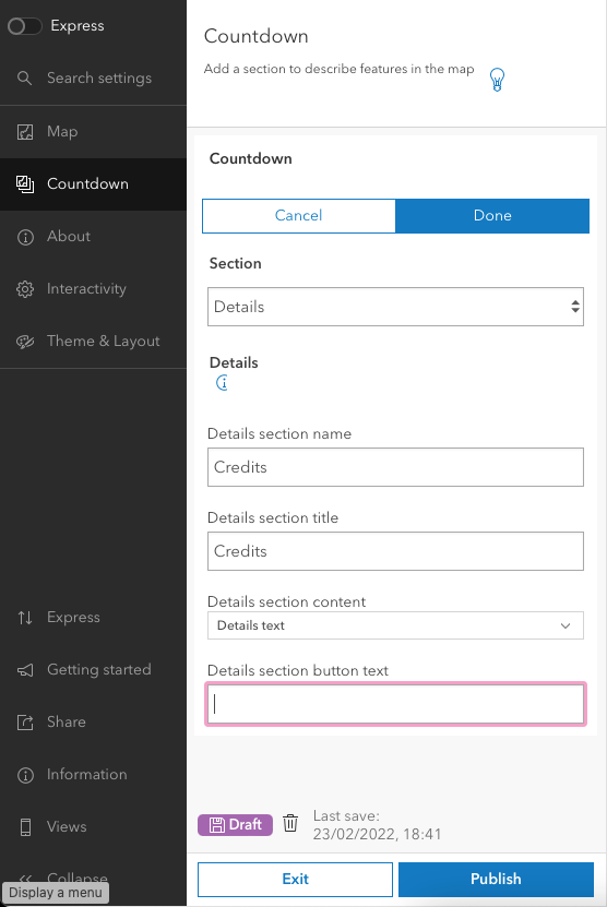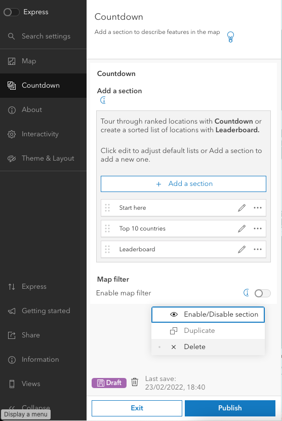We're now going to go through the settings on the left. Keep the Map section as is and move to the Countdown section.