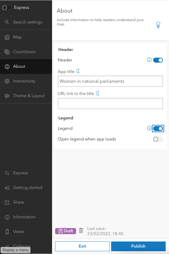 Moving to the About section on the left, enable Legend.