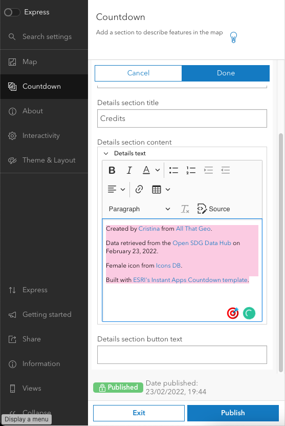 🎉 Congratulations! You have just created an interactive web application with the ArcGIS Instant Apps Countdown template