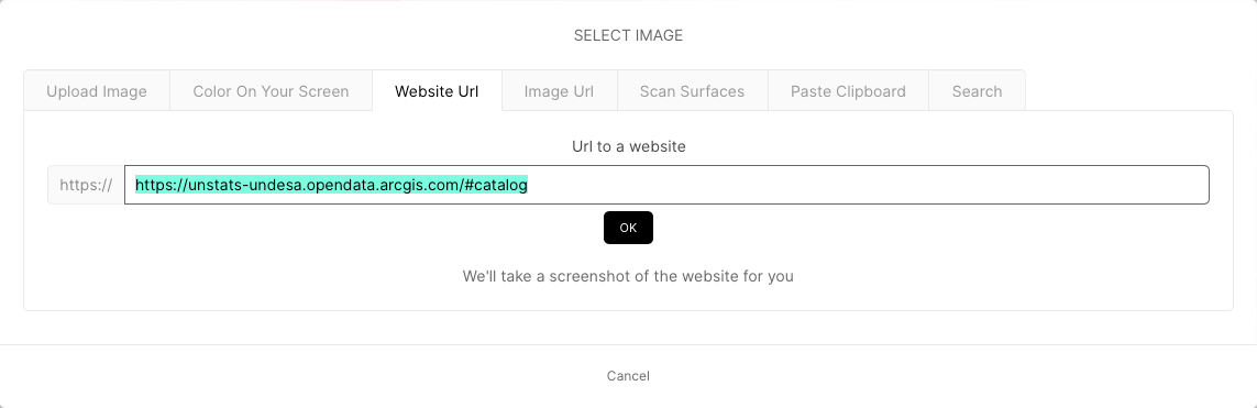 Now select Website URL in the modal and enter https://unstats-undesa.opendata.arcgis.com/#catalog. Hit OK.